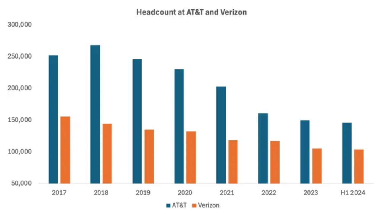 Por ejemplo, a pesar de mostrar un desempeño relativamente estable en el último trimestre, Verizon anunció en septiembre un cargo de $1.4 mil millones de dólares relacionado con la salida de 4,800 empleados. Otro gigante como AT&T, continuó con reducciones de personal en varias divisiones, como parte de un plan para priorizar inversiones en infraestructura crítica.