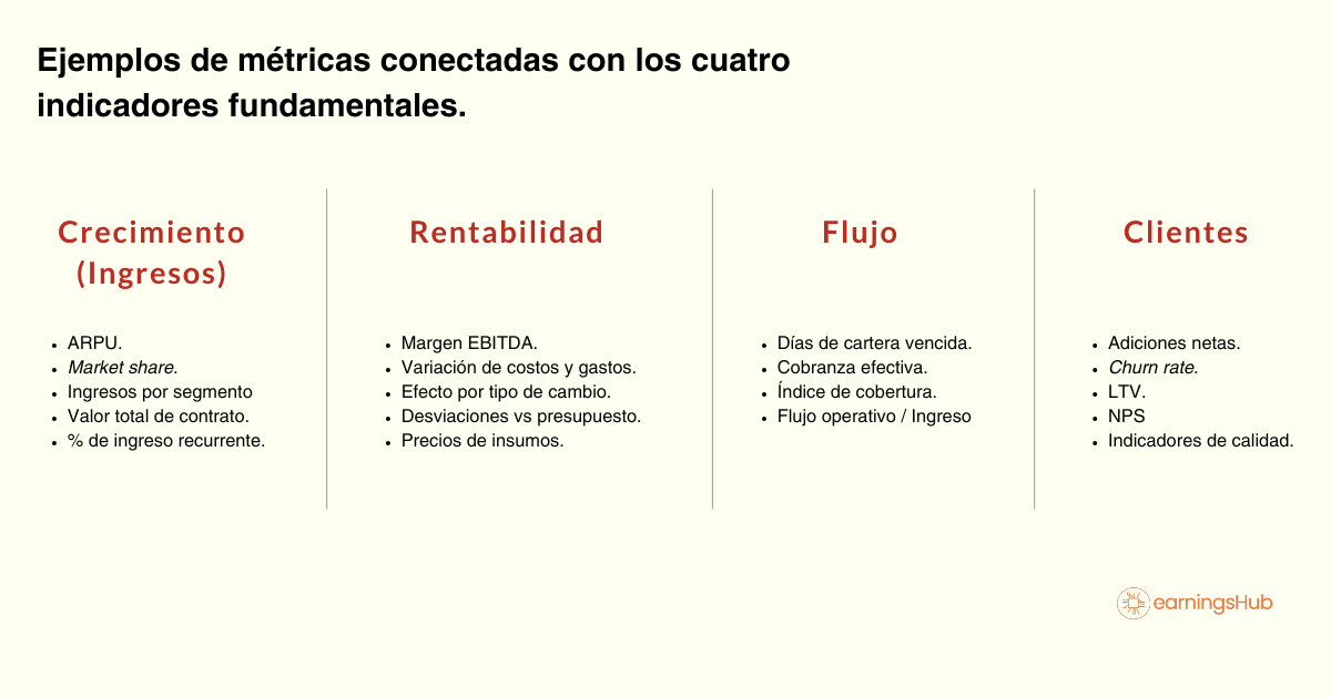 Tabla de ejemplos de mƩtricas conectadas con los cuatro indicadores clave.